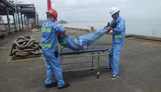 发现码头有值班人员受伤,救护组立即对其进行救护。