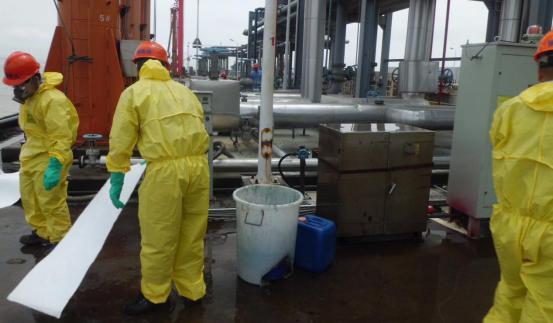 发现有大量含油事故污水流向海洋,立即出动溢油清理组使用半边桶、吸油棉、消油剂和喷洒机对输油臂隔油池和码头平台进行清理回收。