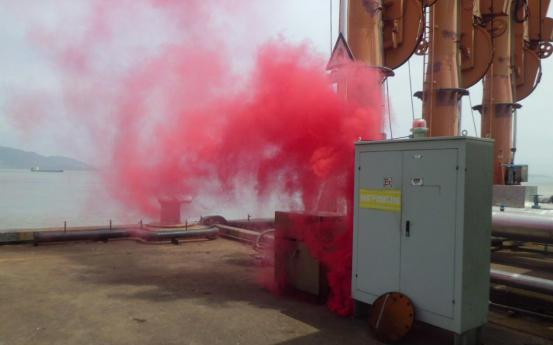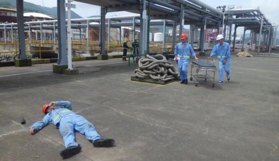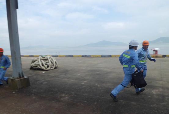 模拟可疑人员潜入我港口设施,欲强行偷渡登外轮,被值班人员拦下,可疑人员拒绝配合询问并对码头输油臂进行纵火破坏,现场指挥立即指令保安人员进行抓捕。