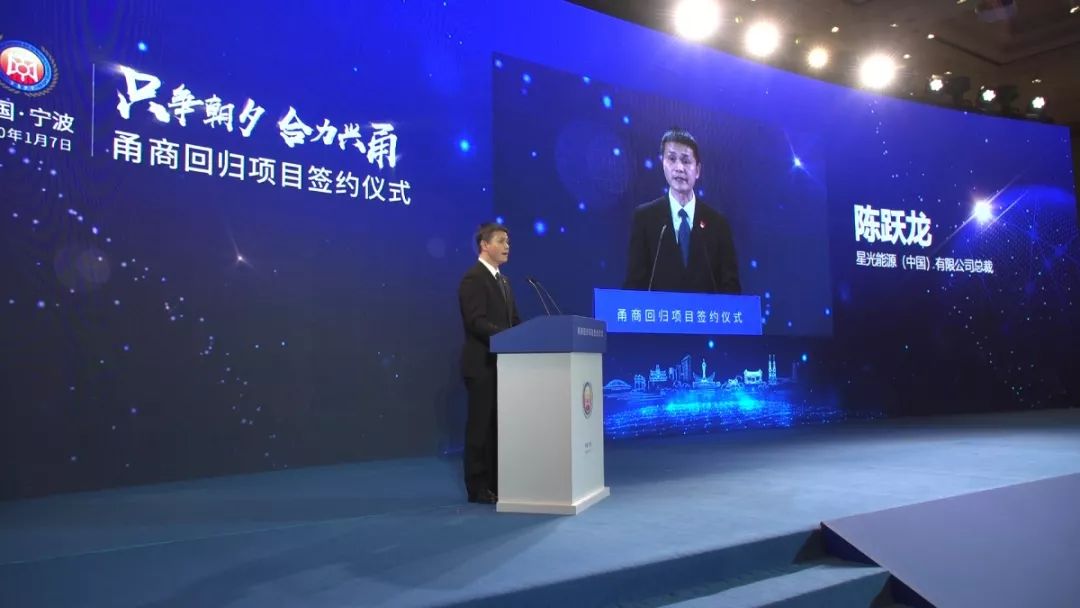 1月7日下午,星光能源(中国)有限公司董事长华靖,总裁陈跃龙受邀于宁波参加甬商回归项目签约仪式并受到了省委副书记,市委书记郑栅洁的亲自接见。陈跃龙总裁代表星光能源在此次会议上做了发言。