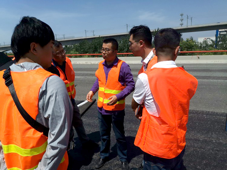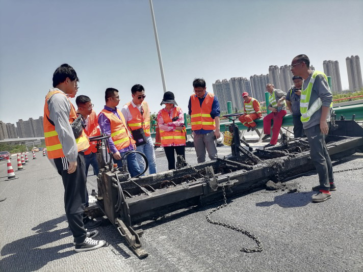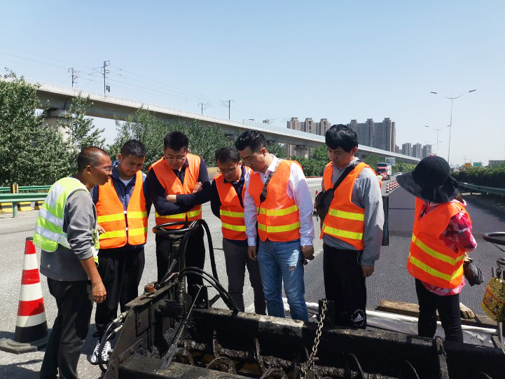 在绕城高速西段,我们与西安顺捷宋总就微表处改性乳化沥青产品的性能、品质及现场应用进行了沟通交流,宋总对该产品的各项指标及性能都给予了高度评价,并现场为大家讲解了微表处摊铺箱的结构和施工工艺,带领大家观看了改性乳化沥青微表处的摊铺过程。