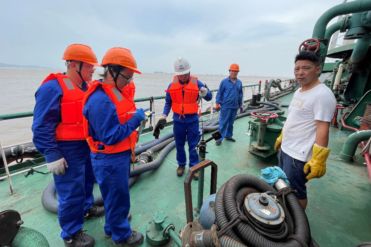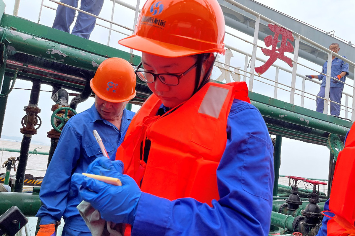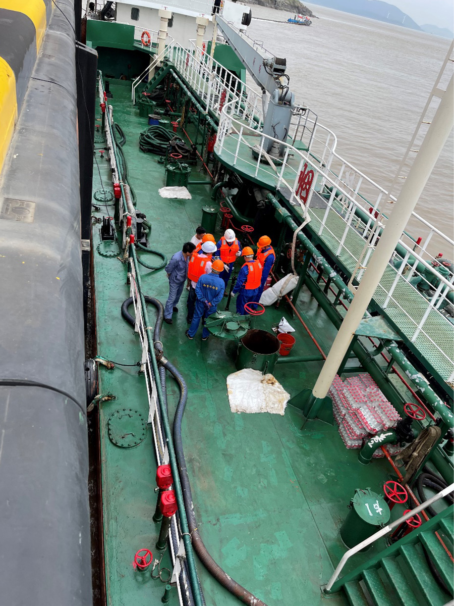 11点30分,慈航9号抵达海靖码头1#泊位,在海靖码头操作人员熟练的带缆作业下,船舶稳稳的停靠在码头上,待架设好悬梯后,化验班组的员工登船进行油样采集、量尺作业,随后接输油管往油罐抽取油污水。
