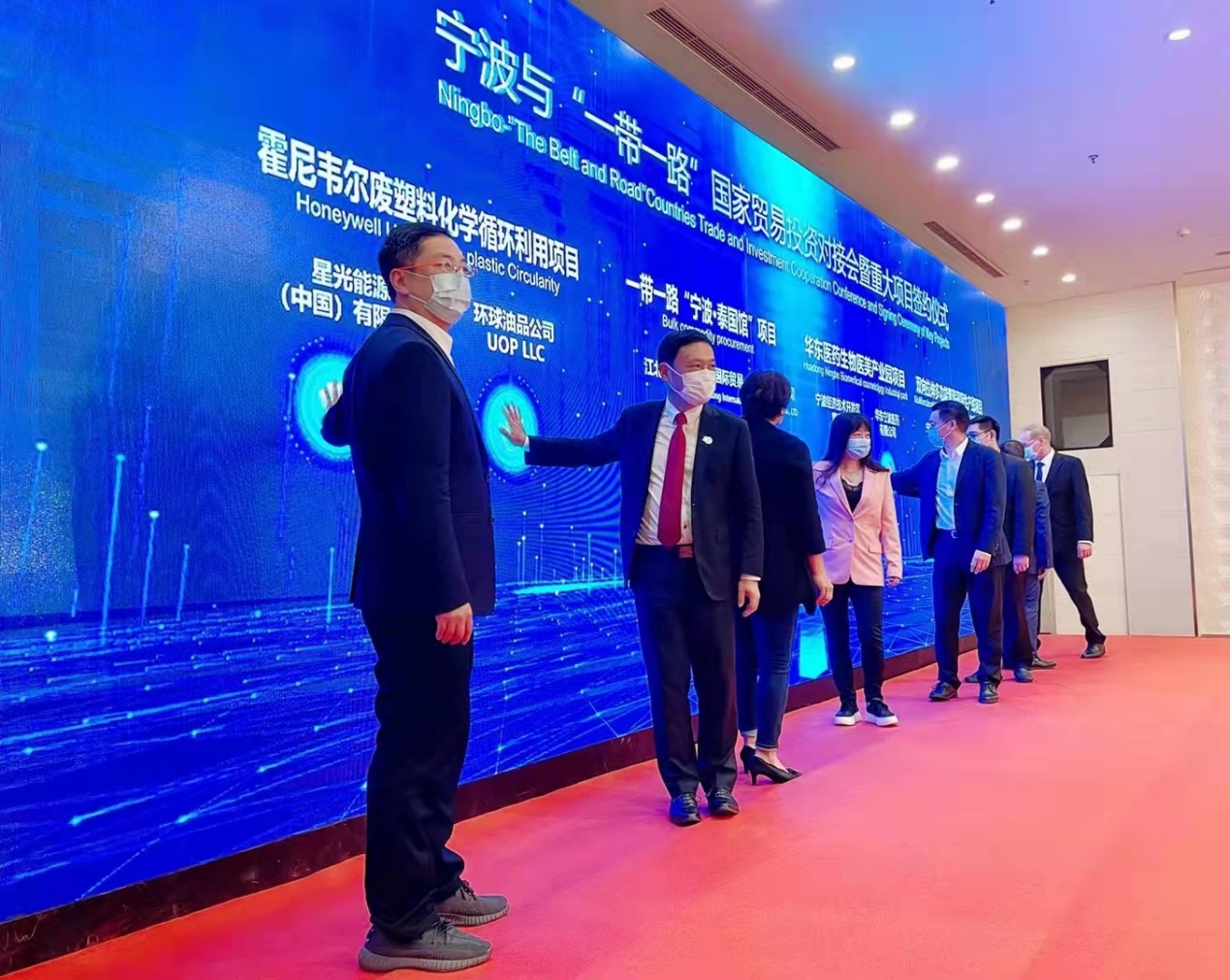 2021年11月6日下午,星光能源本届进博会第二单签约完成,在宁波与“一带一路”国家贸易投资对接会暨重大项目签约仪式上星光能源携手全球科技业巨擎世界五百强霍尼韦尔特性材料集团签署合作协议,计划投资四千万美元,引进先进技术投建一家废塑料循环利用工厂。