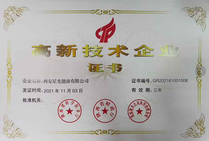 根据国家《高新技术企业认定管理办法》和《高新技术企业认定管理工作指引》的相关规定,西安星光能源有限公司于2021年11月3日被认定为国家级高新技术企业。近日,公司也已收到了由陕西省科学技术厅、陕西省财政厅、国家税务总局陕西省税务局联合颁发的“国家高新技术企业”认定证书,由此正式迈入国家高新技术企业行列。