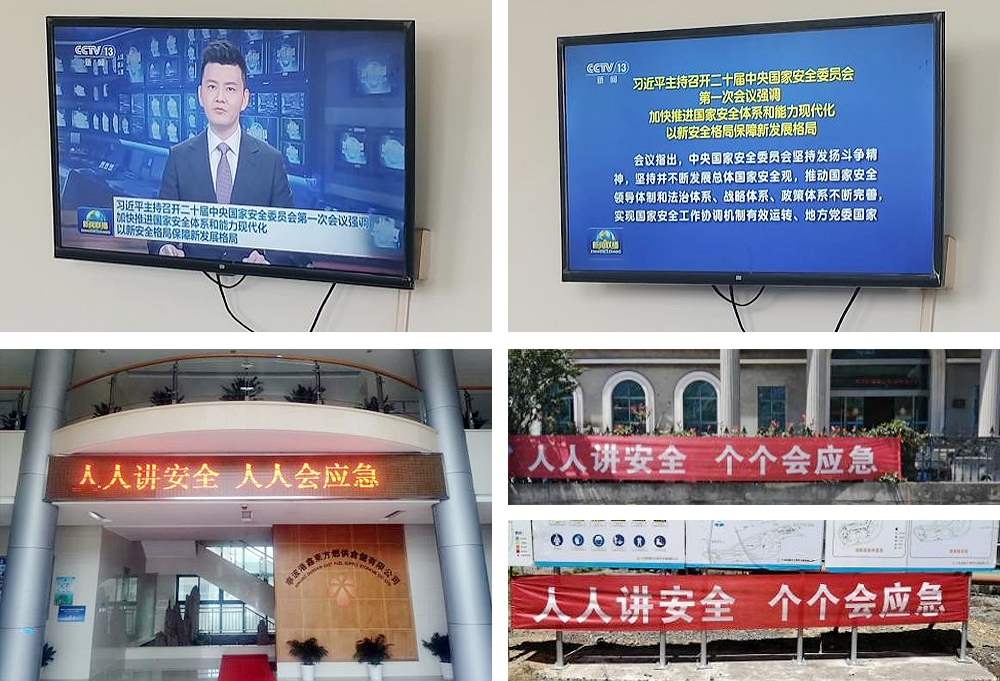 为深入宣传贯彻党中央、国务院关于加强安全生产工作的系列决策部署和重要指示精神,6月1日已在本单位的码头、库区等人员聚集场所张贴悬挂横幅,循环播放安全视频,加强安全信息服务与引导,不断提高从业人员的安全责任意识,推动公司安全文化建设。
