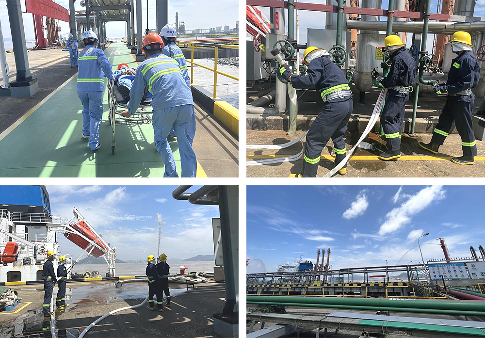 2023年6月26日开展了码头综合应急演练,包含溢油、消防、港口保安。通过演练检验应急处置的实战能力,分析存在问题,进一步完善预案及应急处置措施,切实提高整体应急反应能力。