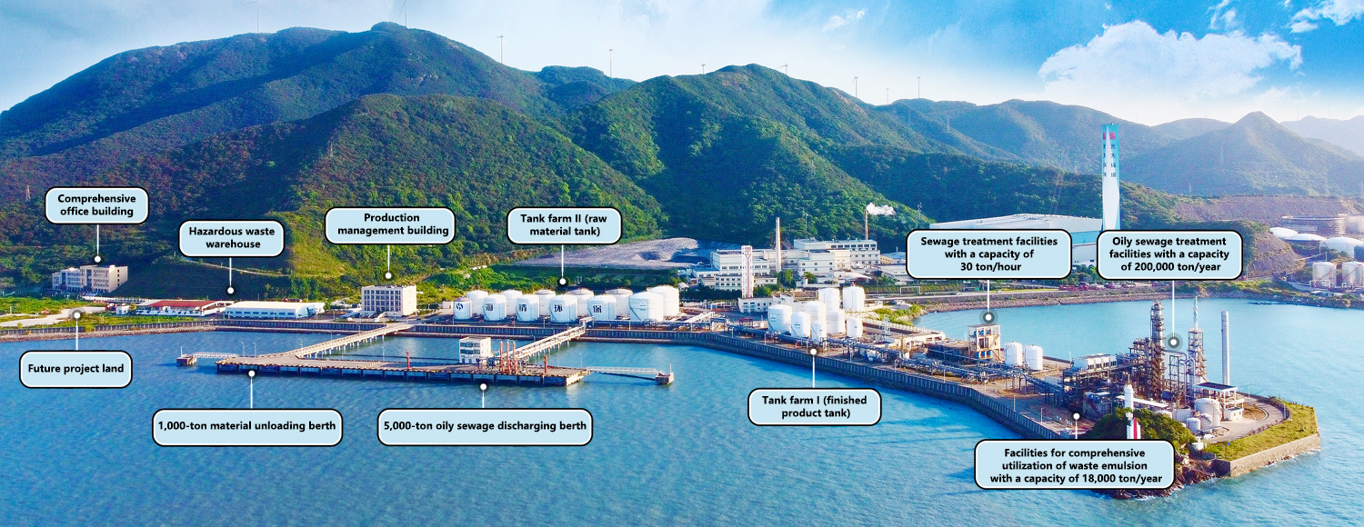 Haijing Environmental has one 5,000-ton and one 1,000-ton berth, which are used for reception and disposal of oily sewage from ships as well as loading and unloading of emergency rescue materials for oil spills. The company is equipped with the largest device for comprehensive utilization of oily sewage in China with a capacity of 200,000 tons/year, a tank farm with a capacity of 40,000 cubic meters, 18 storage tanks of different sizes, an oil spill emergency material warehouse of 3,500 square meters, a ship waste classification yard of 25,000 square meters, a sewage treatment plant with a capacity of 30 tons/hour, a waste emulsion treatment device with a capacity of 18,000 tons/year, a malodorous waste gas treatment device, and other facilities for environmental protection projects as well as public facilities for power, heat, and gas supply. The project which covers an area of approximately 188 mu (12.53 hectares) is adjacent to Ningbo Gangxin Warehousing Base. The connected coastline of the two bases forms a 3-kilometer deep-water coastline.